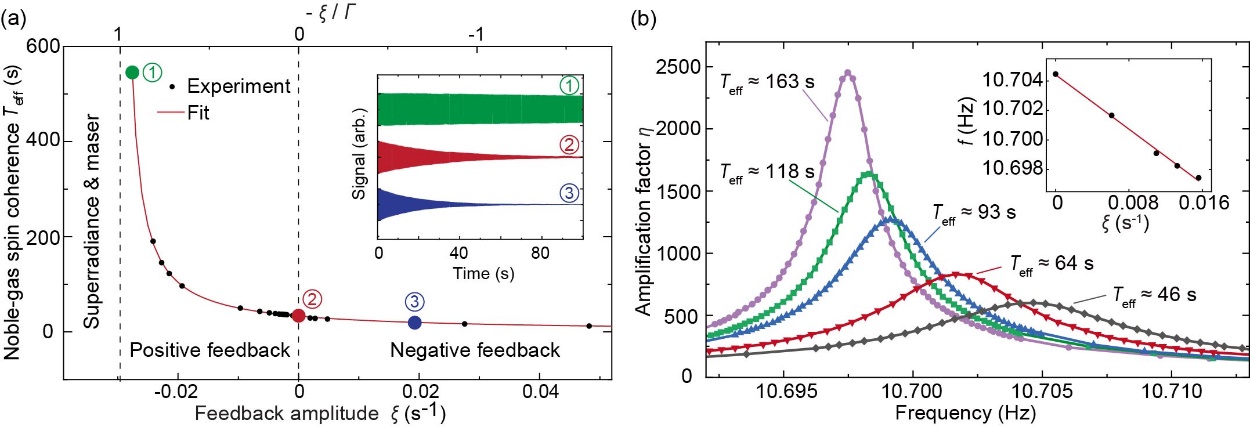 图:(a)惰性气体核自旋相干时间延长。(b)基于协同自旋的磁场放大。