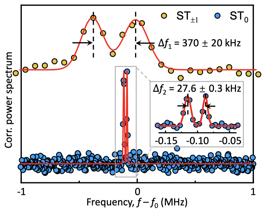 为了观测到谱线窄化,实现高分辨率谱学探测,还需要消除金刚石量子传感器自身带来的谱线展宽。杜江峰等人受到核磁共振中关联探测的启发,设计了一种适用于零场的顺磁共振关联序列,抑制了金刚石量子传感器的本征展宽。用此新方法,研究人员在实验中成功实现金刚石中单个氮原子电子自旋的窄化跃迁探测,相较之前通用的方法谱线分辨率提升了27倍,达到8.6 khz,这是目前基于金刚石量子传感器微观顺磁共振谱学的最高指标。