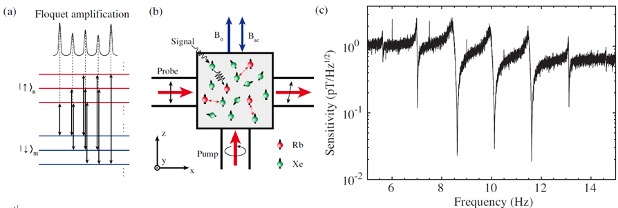 成果示意图: (afloquet能级;(bflqouet量子自旋放大器原理图;(c)磁探测灵敏度。
